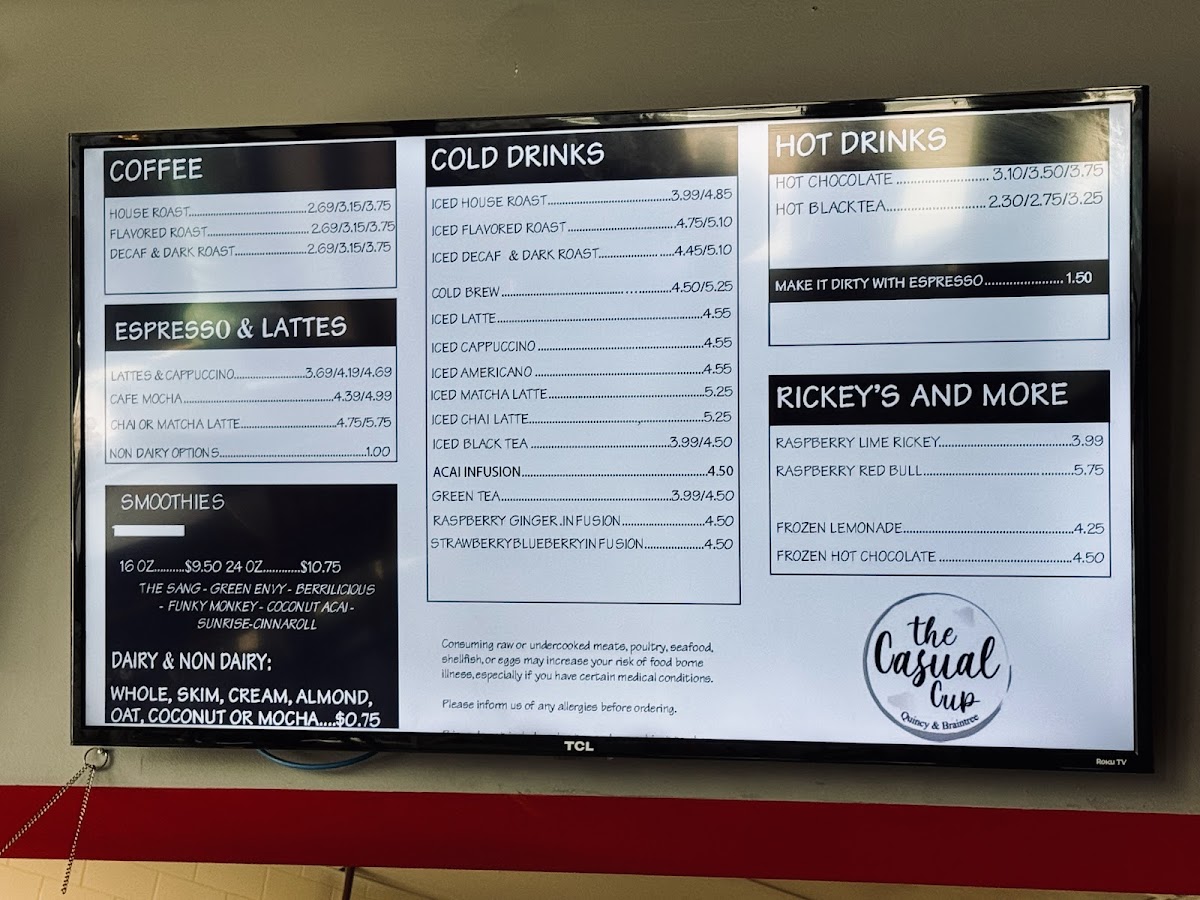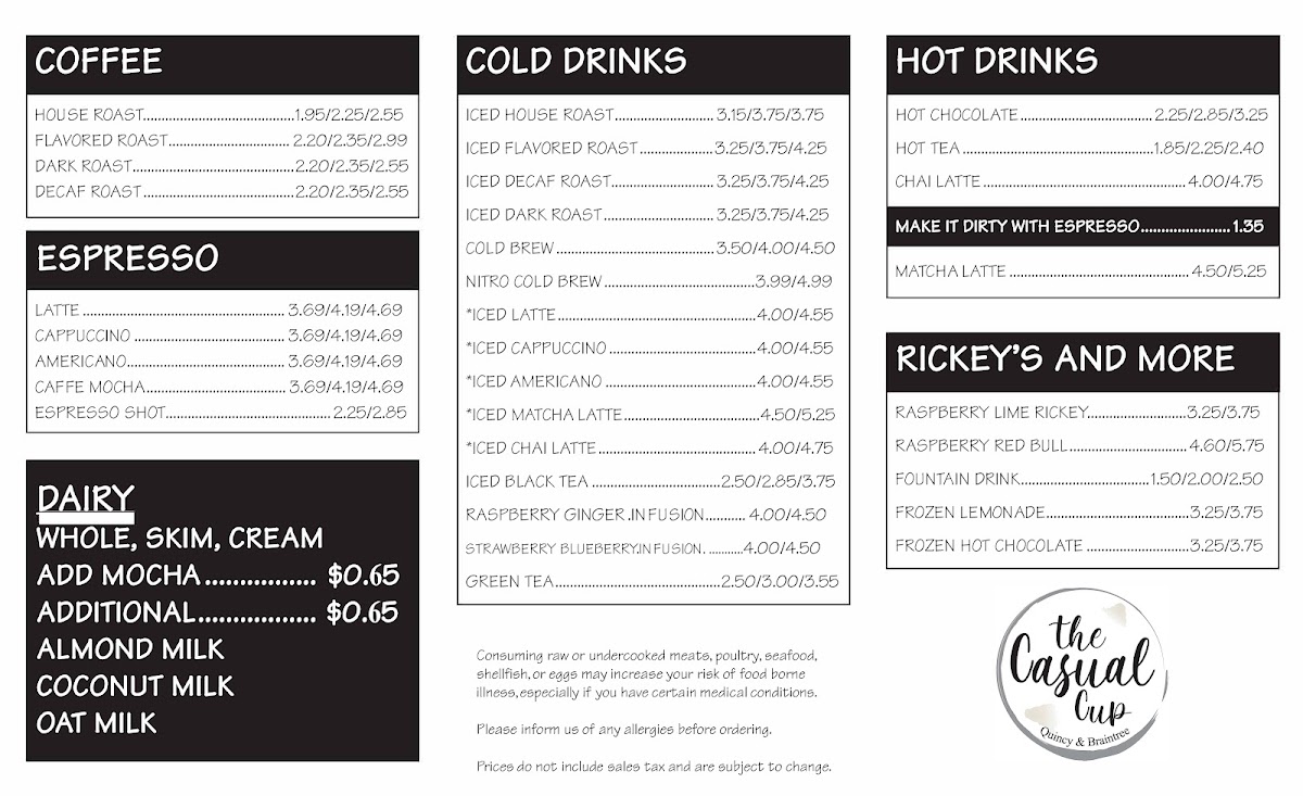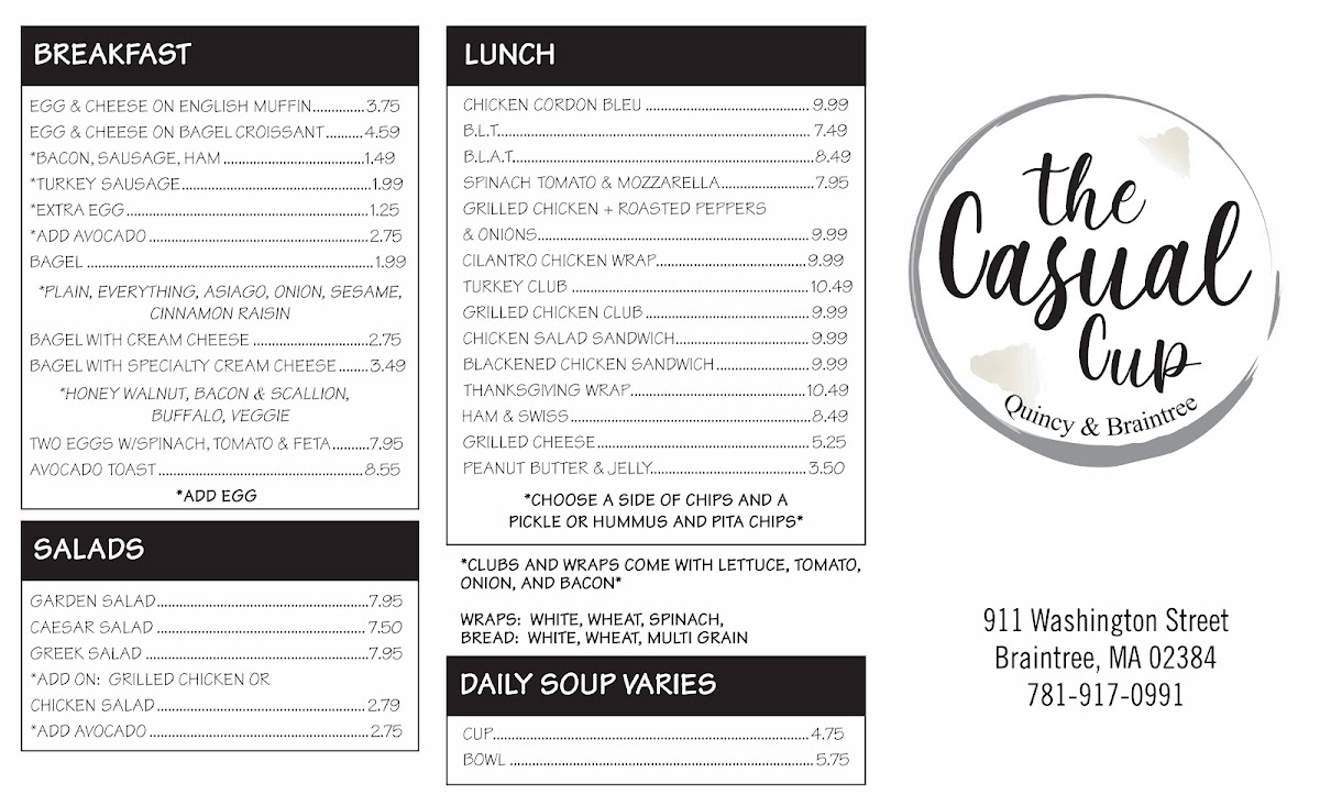 When you walk into The Casual Cup Cafe, located at 911 Washington St, Braintree, MA, you're greeted by a warm and inviting atmosphere that's perfect for grabbing a bite with friends or just unwinding on your own. The menu here is a delightful mix of comfort food and fresh options, making it easy to find something that hits the spot no matter what you're in the mood for. From freshly brewed coffee to hearty sandwiches and delicious pastries, every item feels crafted with care. Whether you're starting your day with a perfectly toasted bagel or grabbing a quick lunch, the choices are satisfying and never bland. Don't forget to check out their daily specials - they're always offering something new that you won't want to miss. With its cozy vibe and tasty menu, The Casual Cup Cafe Menu has something for everyone, whether you're stopping by for a quick treat or a full meal.
